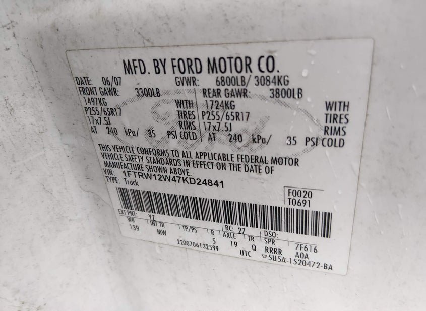 - VIN: 1FTRW12W47KD24841