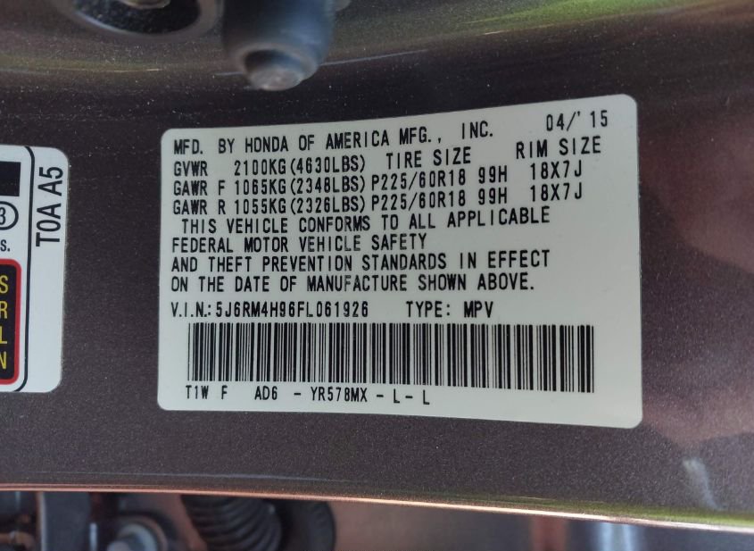 - VIN: 5J6RM4H96FL061926