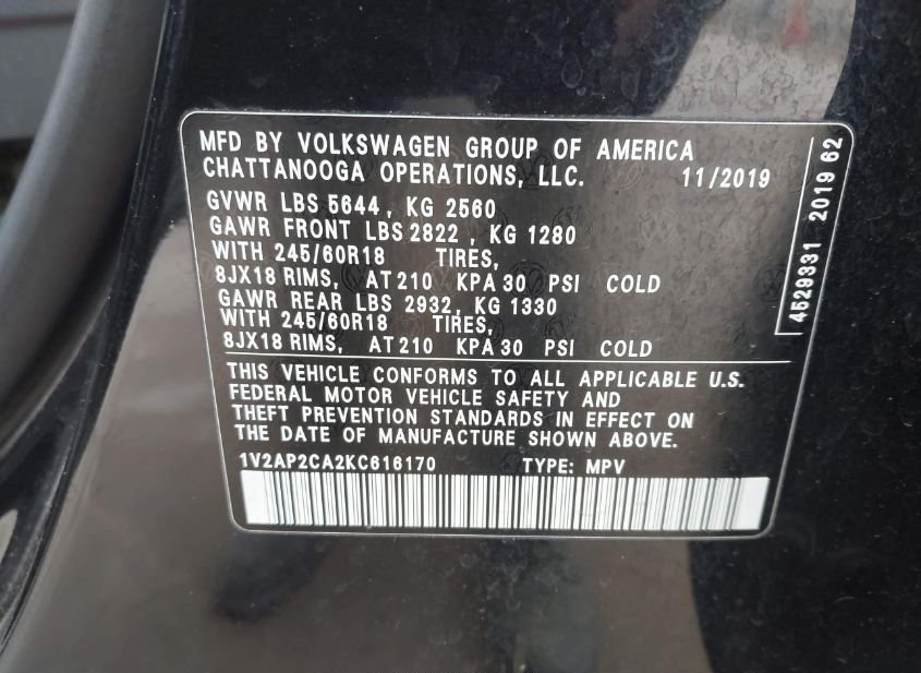 - VIN: 1V2AP2CA2KC616170