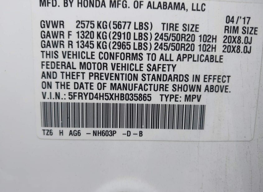 - VIN: 5FRYD4H5XHB035865