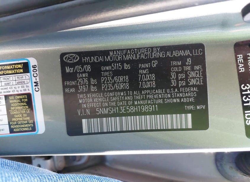 - VIN: 5NMSH13E58H198911