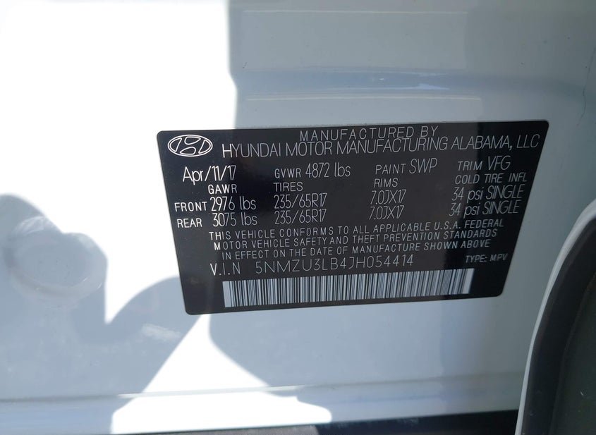 - VIN: 5NMZU3LB4JH054414
