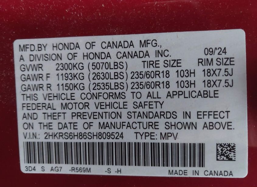- VIN: 2HKRS6H86SH809524