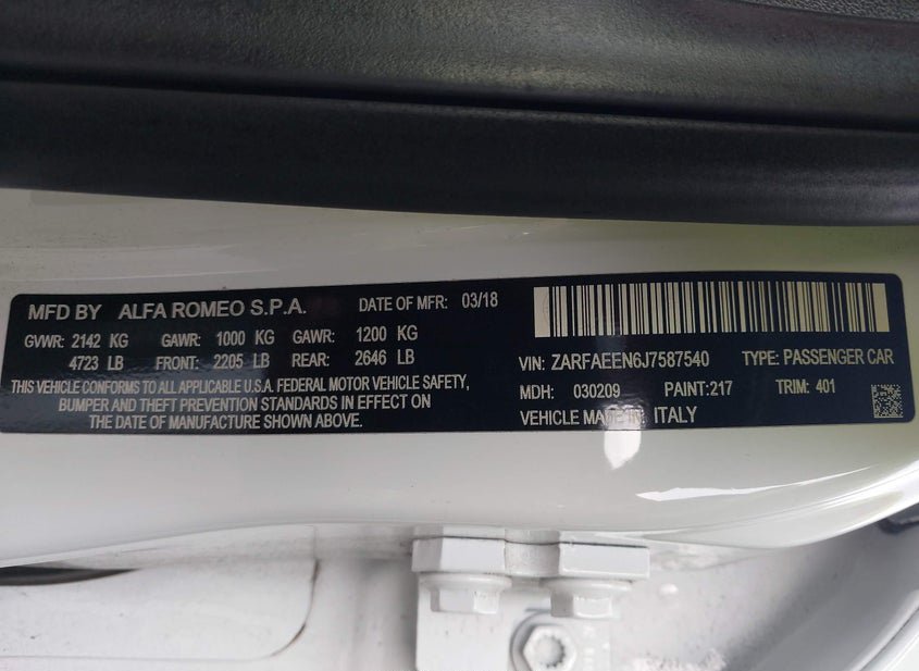 - Название лота: 2018 ALFA ROMEO GIULIA TI SPORT AWD