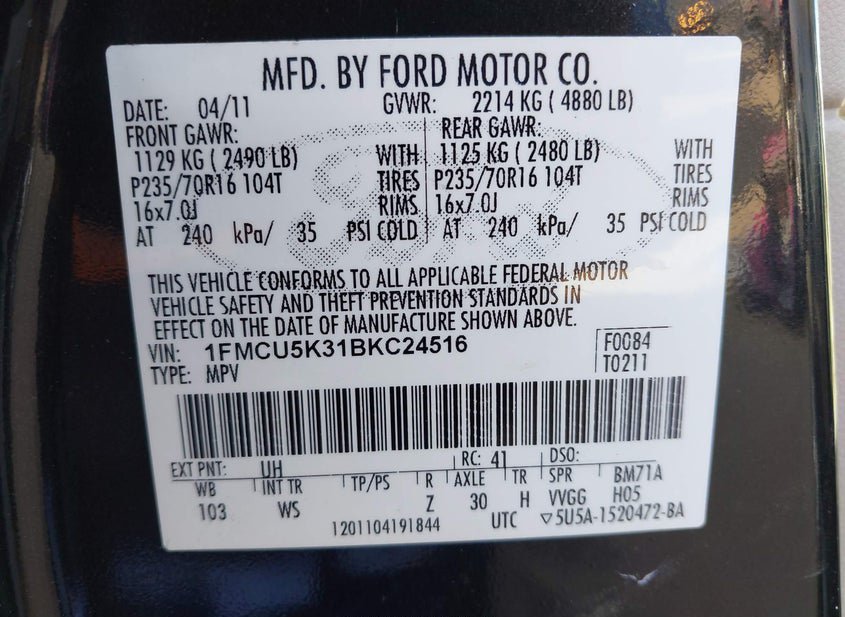 - VIN: 1FMCU5K31BKC24516