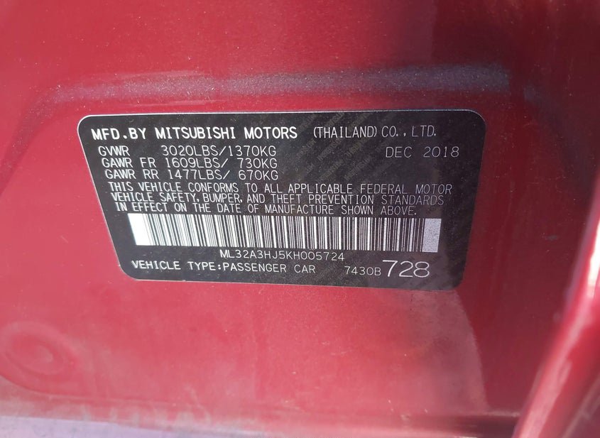 - Название лота: 2019 MITSUBISHI MIRAGE ES