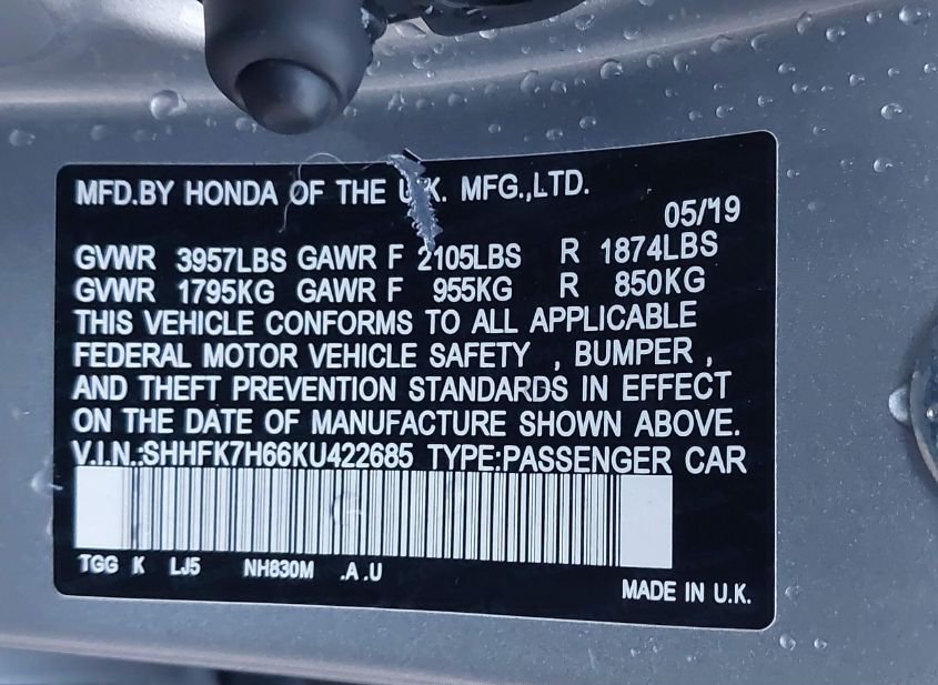 - VIN: SHHFK7H66KU422685