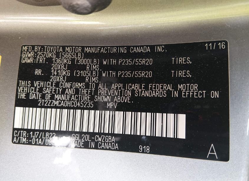 - VIN: 2T2ZZMCA0HC045235