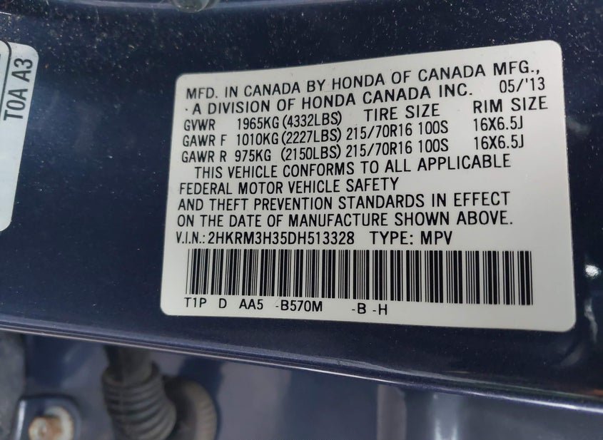 - VIN: 2HKRM3H35DH513328