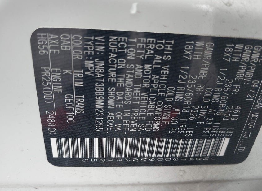 - VIN: JN8AT3BB9MW231255