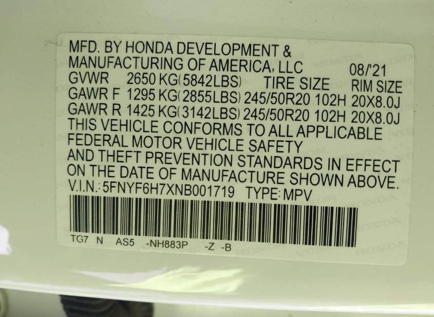 - VIN: 5FNYF6H7XNB001719