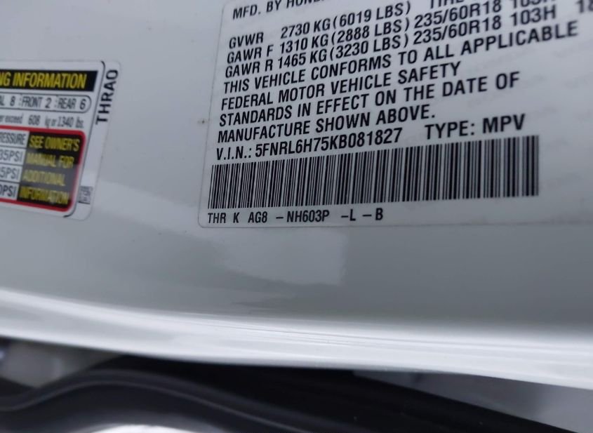 - VIN: 5FNRL6H75KB081827