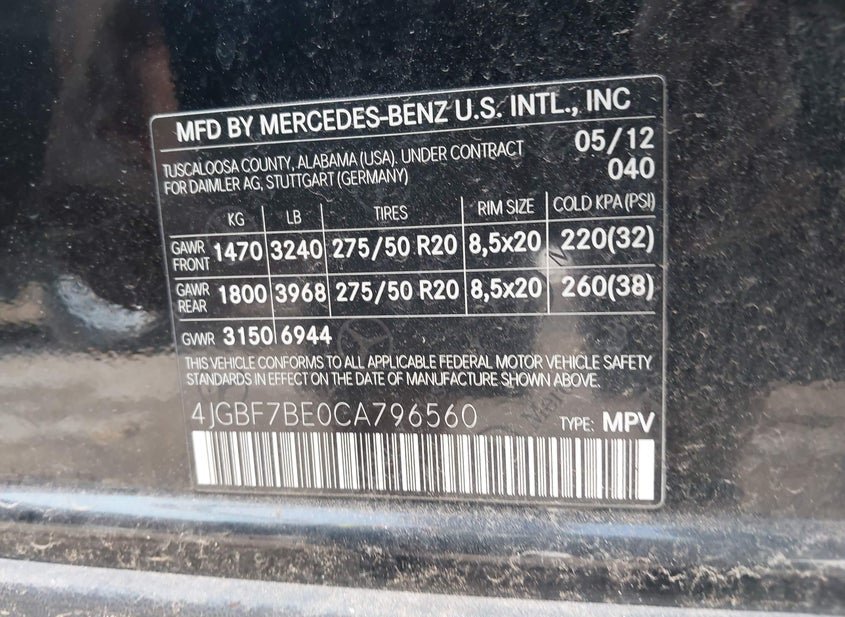 - VIN: 4JGBF7BE0CA796560