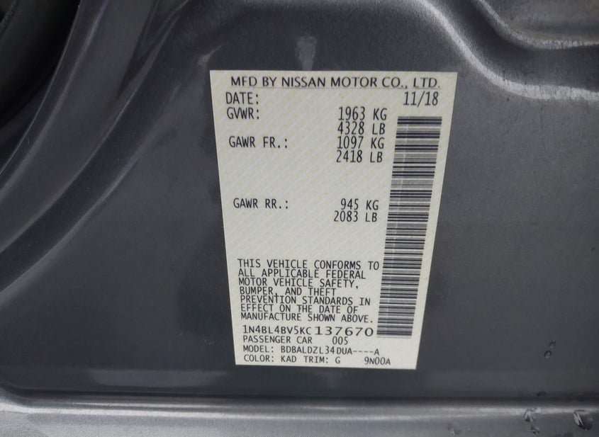 - VIN: 1N4BL4BV5KC137670
