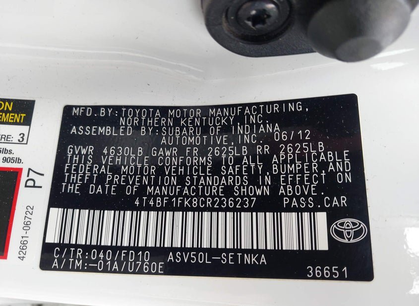 - VIN: 4T4BF1FK8CR236237