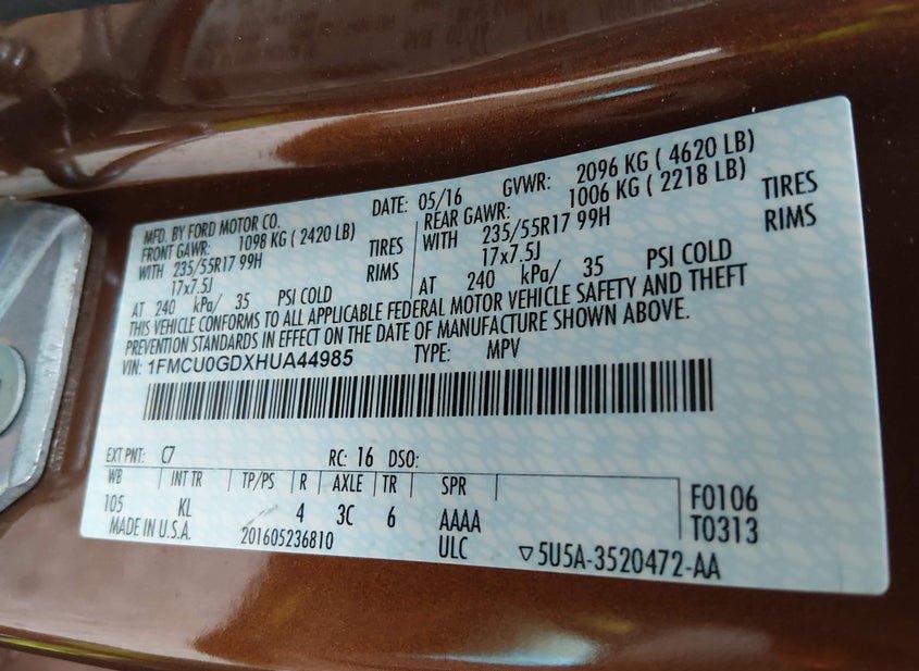 - VIN: 1FMCU0GDXHUA44985