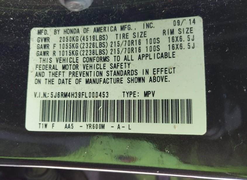 - VIN: 5J6RM4H39FL000453