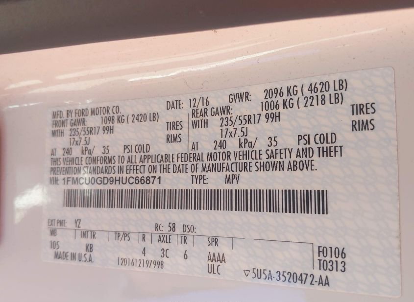 - VIN: 1FMCU0GD9HUC66871