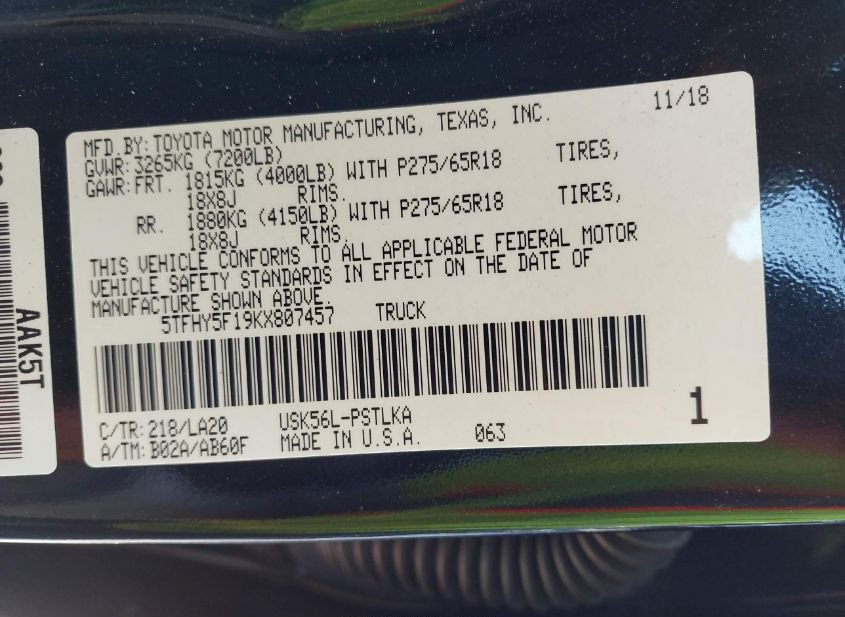 - VIN: 5TFHY5F19KX807457