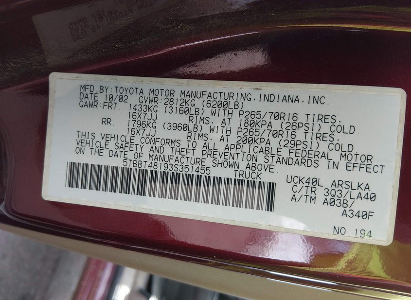 - VIN: 5TBBT48193S351455