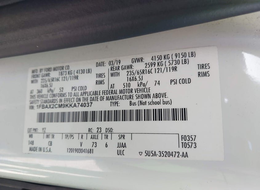 - VIN: 1FBAX2CM9KKA74037