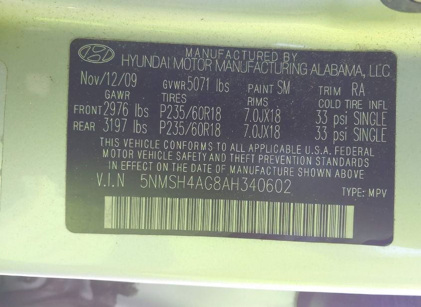 - VIN: 5NMSH4AG8AH340602