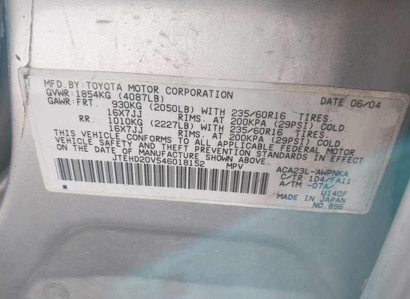 - VIN: JTEHD20V546018152