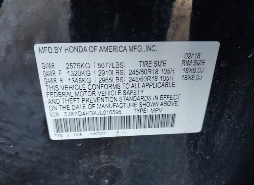 - VIN: 5J8YD4H3XJL010596