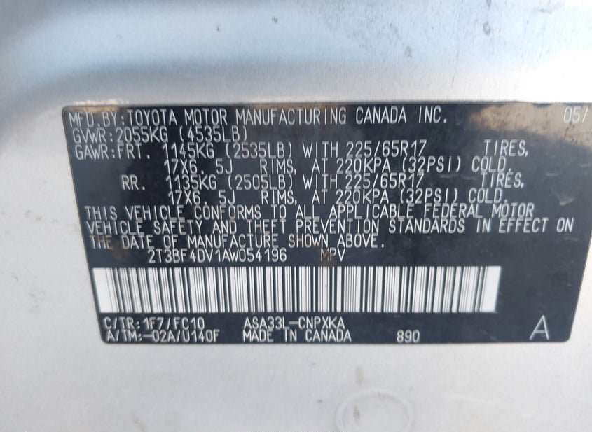 - VIN: 2T3BF4DV1AW054196