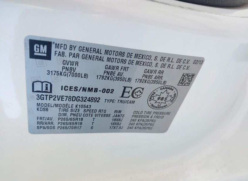 - VIN: 3GTP2VE78DG324892