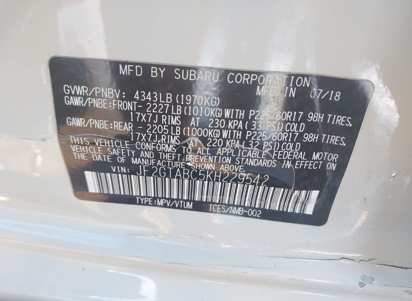 - VIN: JF2GTABC5KH229542