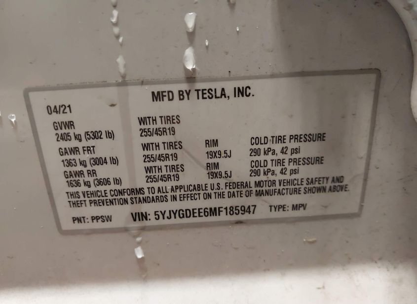 - VIN: 5YJYGDEE6MF185947