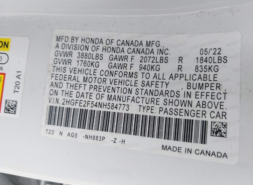 - VIN: 2HGFE2F54NH584773
