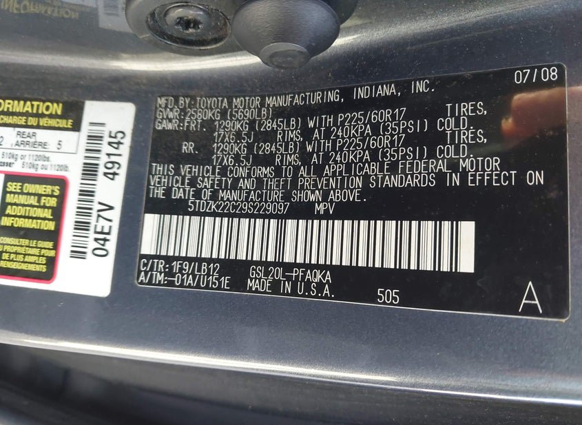- VIN: 5TDZK22C29S229097