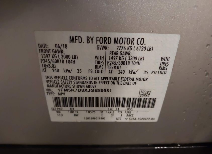 - VIN: 1FM5K7D8XJGB89981
