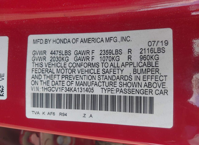 - VIN: 1HGCV1F34KA131405