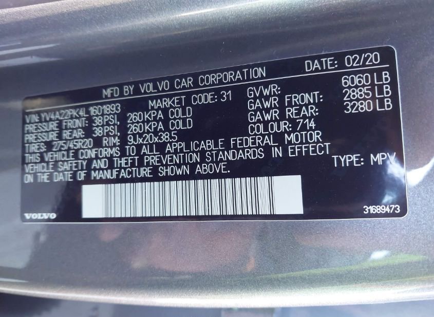- Название лота: 2020 VOLVO XC90 T6 MOMENTUM 7 PASSENGER