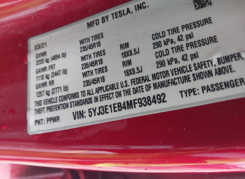 - VIN: 5YJ3E1EB4MF938492
