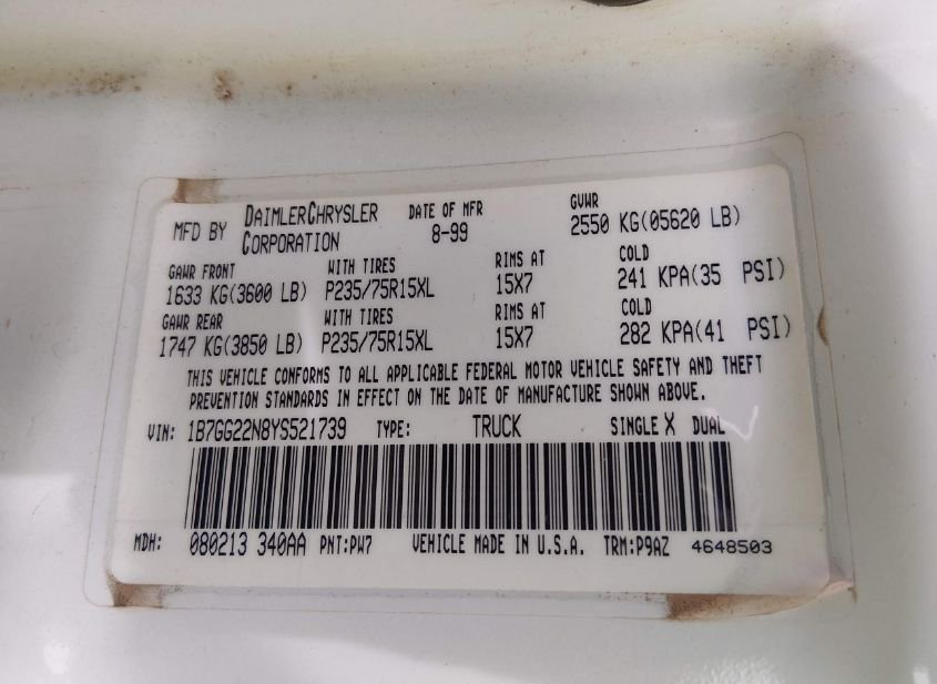 - VIN: 1B7GG22N8YS521739