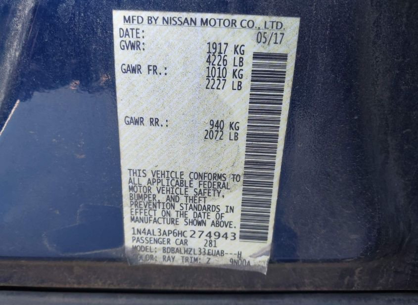 - VIN: 1N4AL3AP6HC274943