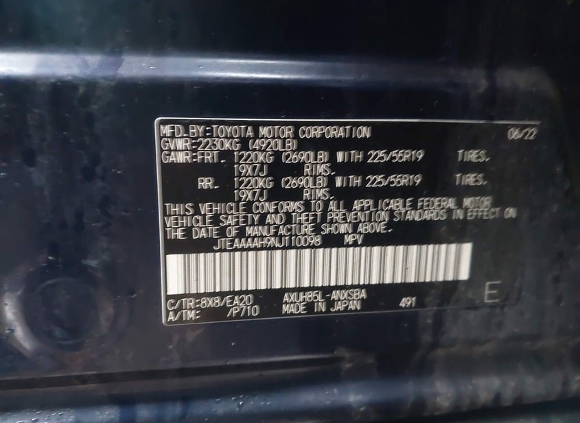 - VIN: JTEAAAAH9NJ110098