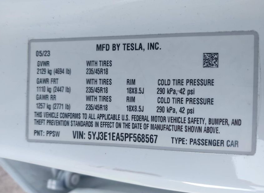- VIN: 5YJ3E1EA5PF568567