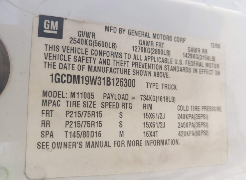 - VIN: 1GCDM19W31B126300