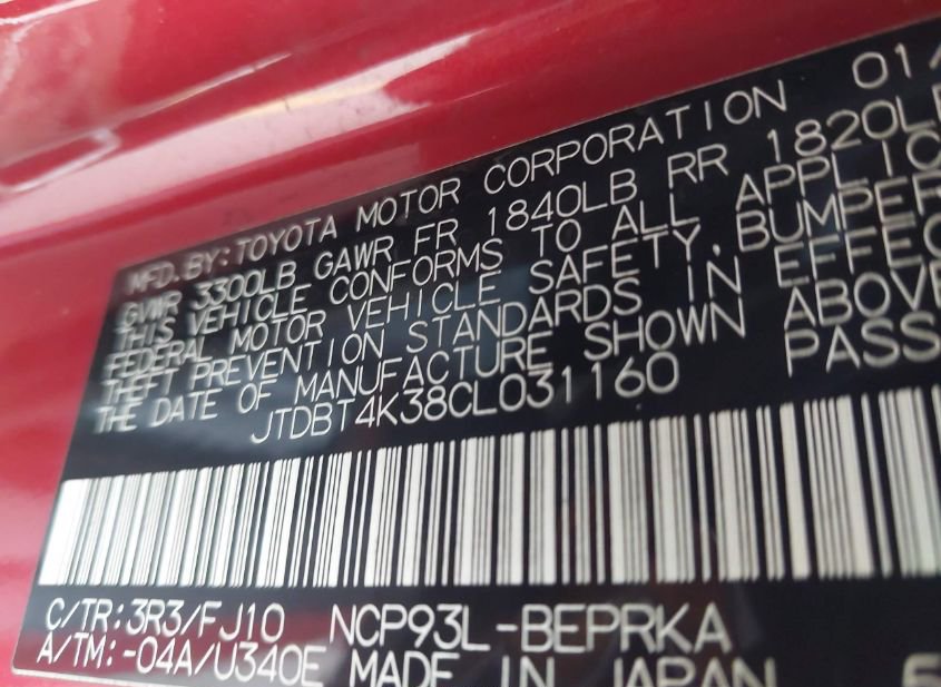 - VIN: JTDBT4K38CL031160
