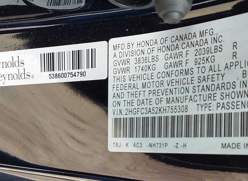 - VIN: 2HGFC3A52KH755308