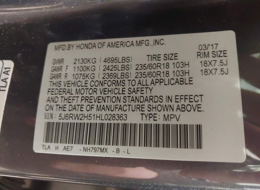 - VIN: 5J6RW2H51HL028363