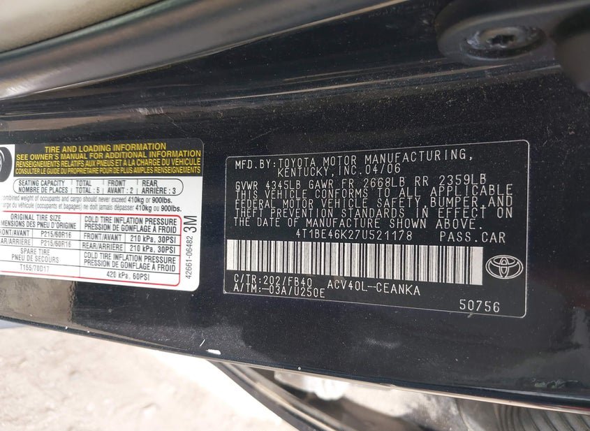 - Название лота: 2007 Toyota Camry 2.4L