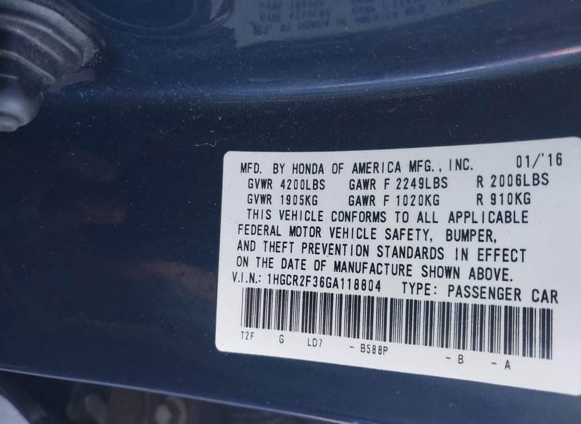 - VIN: 1HGCR2F36GA118804