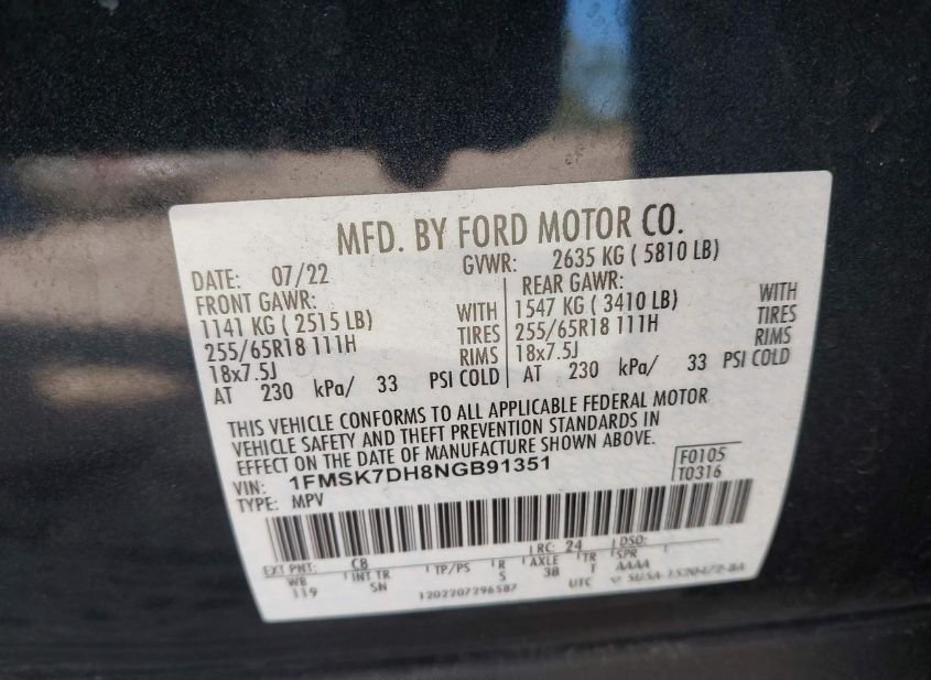 - VIN: 1FMSK7DH8NGB91351