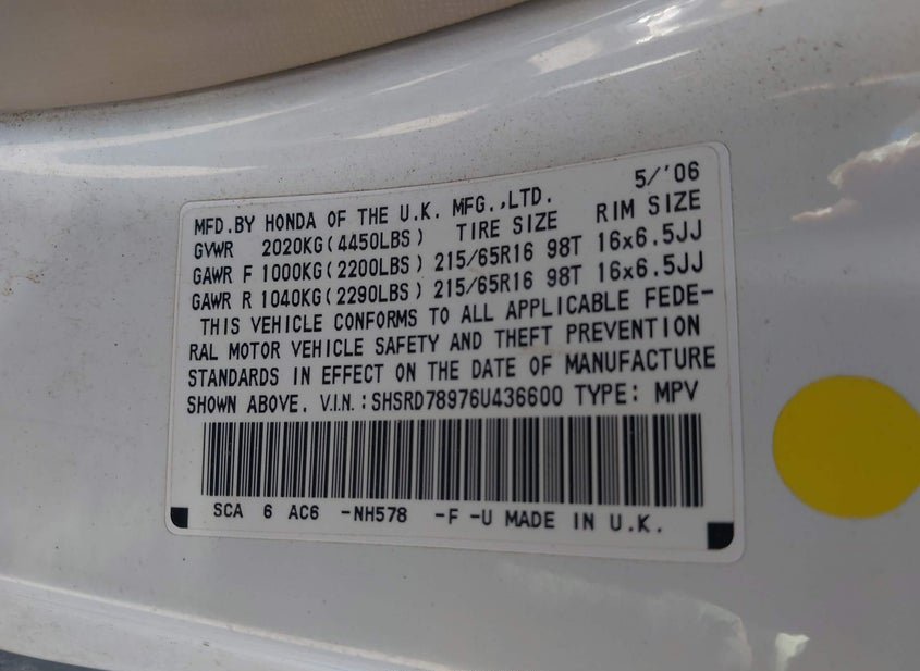 - VIN: SHSRD78976U436600